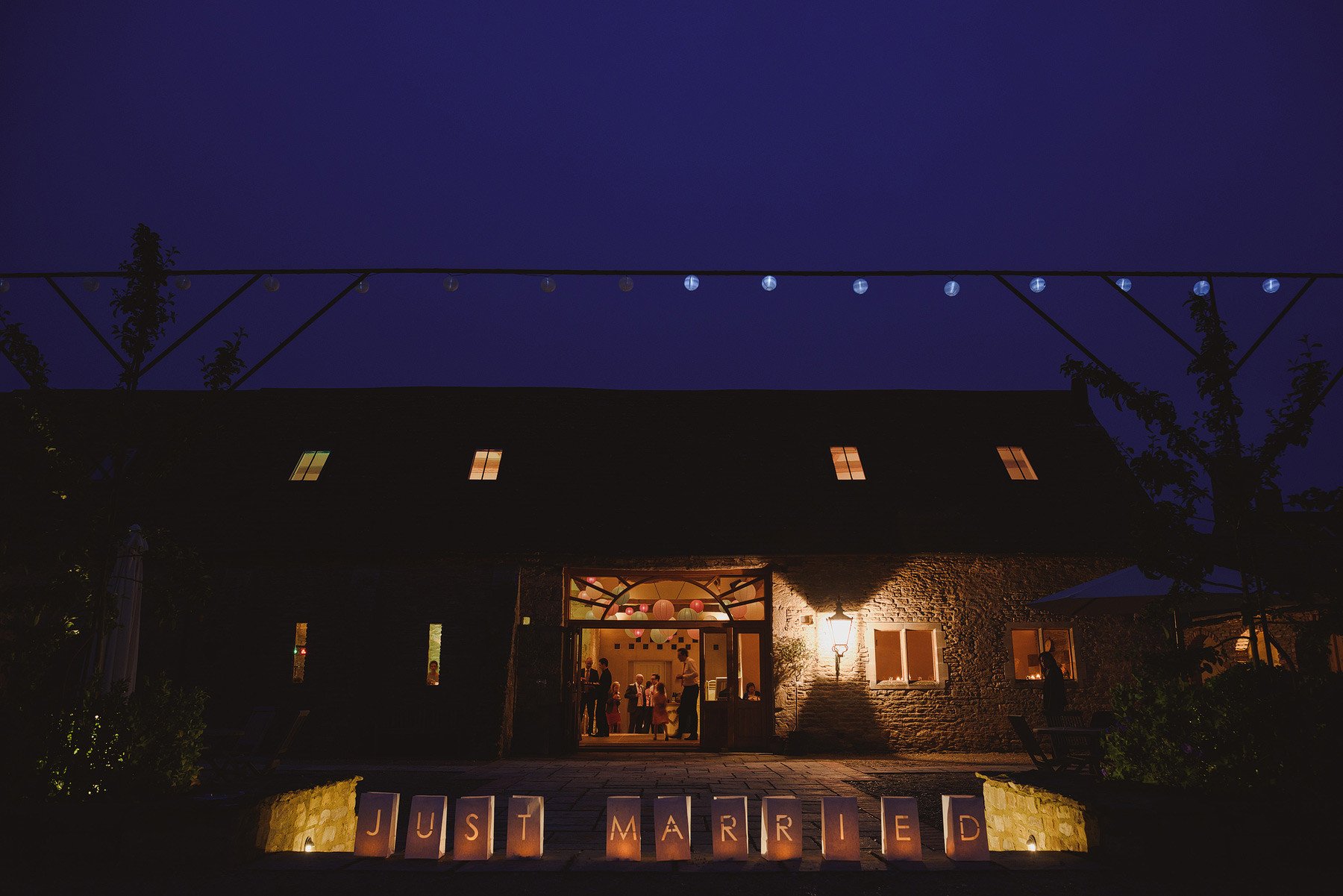 A dimly lit barn at night displays illuminated letters spelling JUST MARRIED at the entrance. Warm light spills from inside, highlighting guests and creating a cozy atmosphere ideal for documentary wedding photographers. String lights decorate above, adding a festive touch.
