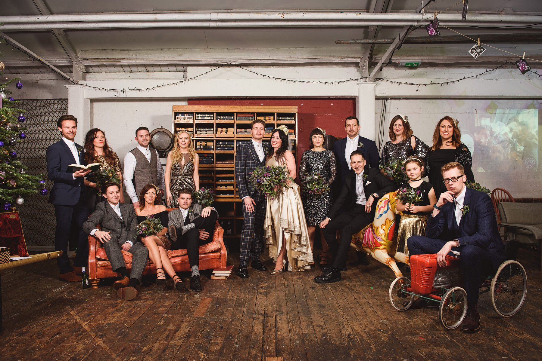 A group of people dressed in formal attire pose in an industrial-style room with wooden floors. Some are sitting on a couch, others stand holding glasses and bouquets. Captured by Bristol wedding photographers, a man is seated on a toy car in the foreground, near a Christmas tree on the left.